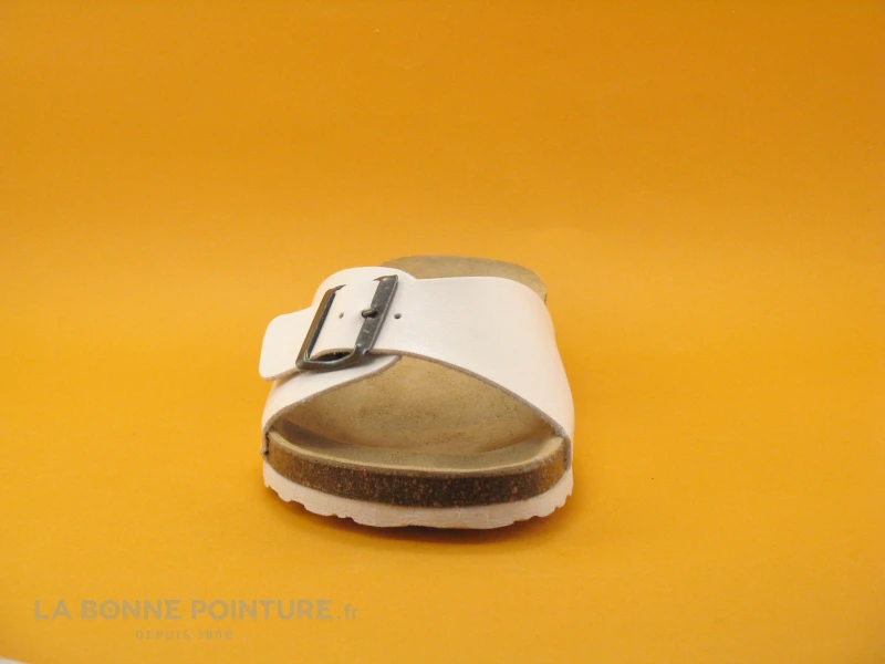 Cette mule mode Homme est en simili cuir blanc, avec une bride réglable 3 positions sur le dessus avec boucle métallique.