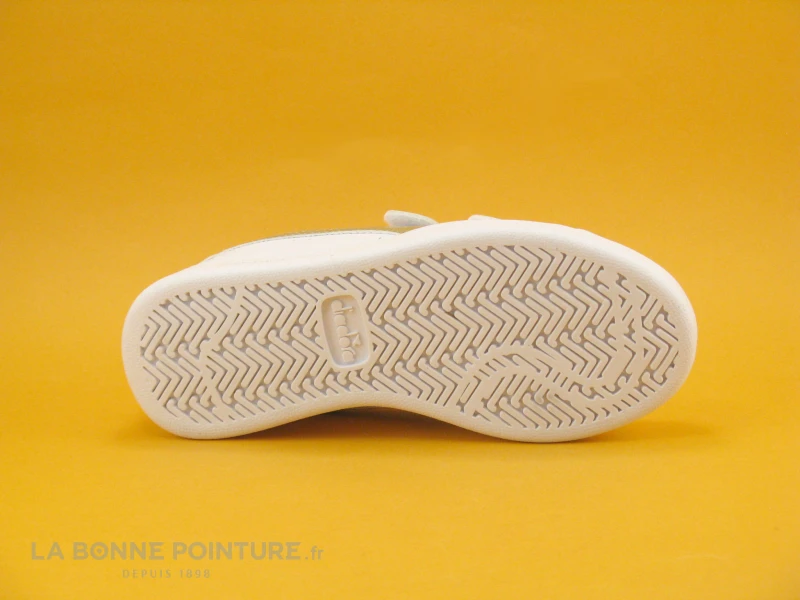 Un empiècement blanc cassé et irisé habille l’arrière des sneakers fille, avec la marque Diadora.