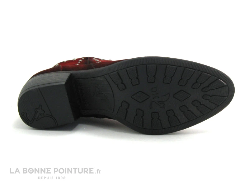 Cette bottine Femme est en cuir velouté rouge foncé / bordeaux, travaillé avec des nuances noircies et un effet poncé qui caractérisent la chaussure Femme Dorking.