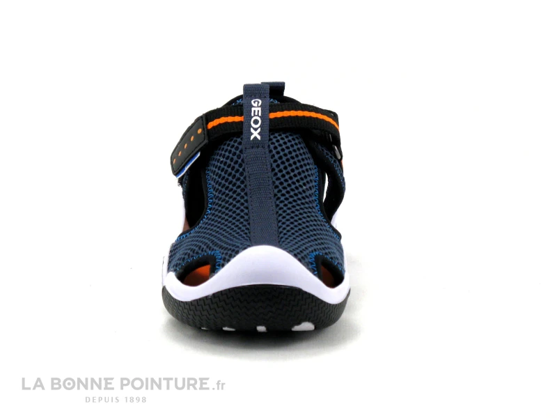 Cette sandale sport enfant Geox Water friendly est en textile bleu marine, avec un peu d’orange fluo et de noir.