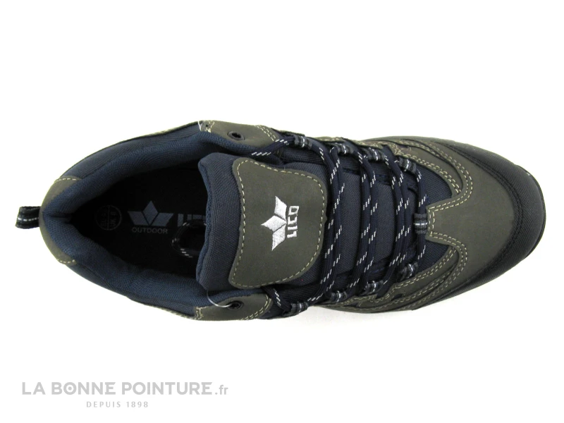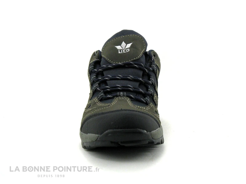 Cette chaussure de randonnée Homme Lico 210097 associe textile et matières synthétiques résistantes, aux tons de bleu marine, de gris et de noir.