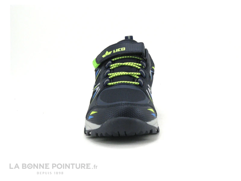 Ces baskets enfant Lico Allen sont en textile et matiÚres synthétiques résistants bleu marine, avec un peu de bleu turquoise et de vert lime.
