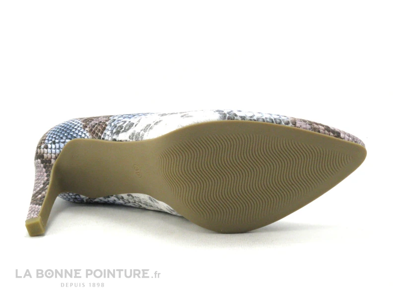 Cet escarpin pointu effet python combine du bleu ciel, du marron, un peu de blanc et de gris.
