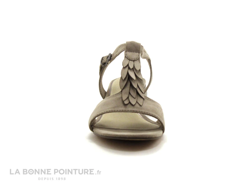 Cette sandale femme est beige velouté (taupe), avec une bride salomé ornée de pétales qui se superposent.