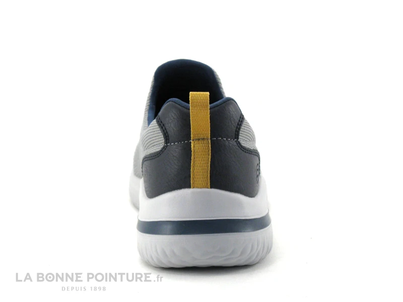 La petite languette jaune / camel à l’arrière aide à enfiler facilement la chaussure Homme Skechers Delson Fairfield.