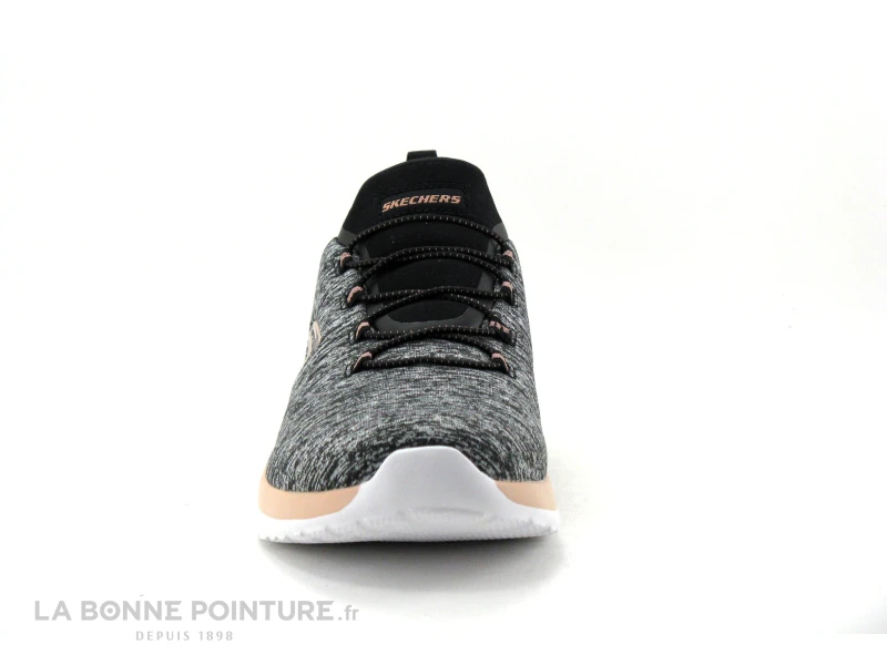 Cette chaussure de sport Femme Skechers est en textile noir et gris, avec une touche de corail.