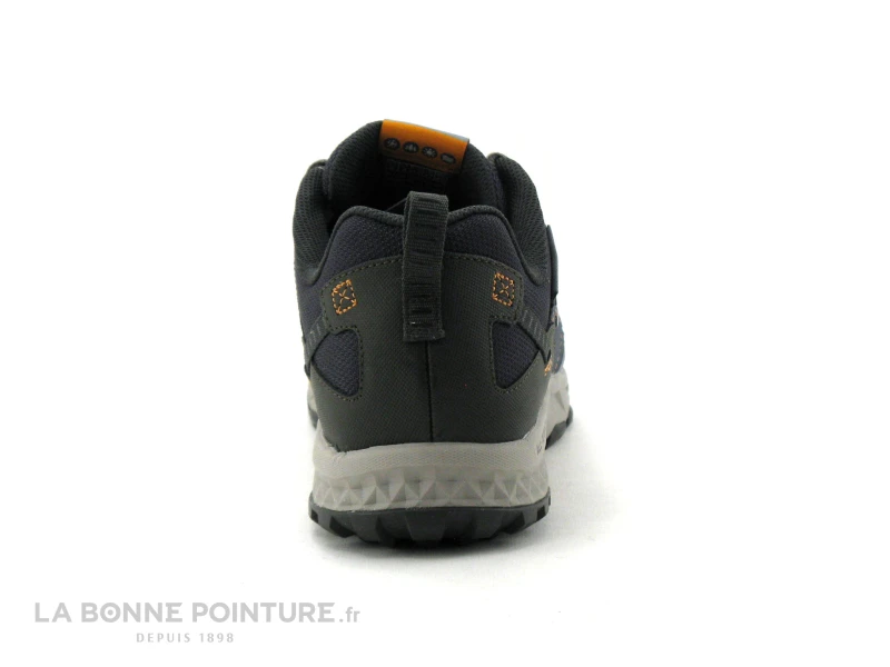 Cette chaussure de sport Homme combine cuir enduit, matières synthétiques et textile résistants, aux tons de bleu et de gris foncé, avec un peu d’orange.