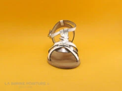 Les trois lanières sur le devant de la chaussure enfant Les Tropéziennes Iria sont assemblées. Elles dissimulent astucieusement un velcro, pour ajuster idéalement la sandale au pied de l’enfant.